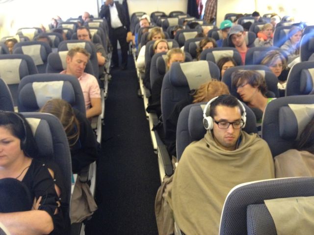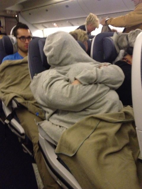 We were all fortunate enough to be able to sit fairly close to one another and we all had aisle row seats to allow a “little” extra leg room. Most everyone watched movies, or played games, or read books for the flight, but the most common thing everyone did was sleep.