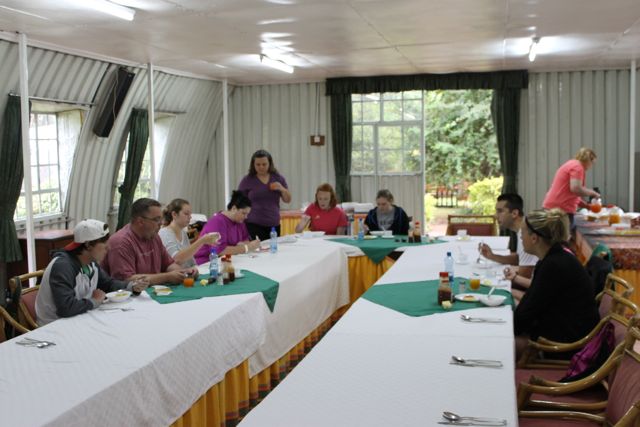 The coffee was a big hit for those that enjoy coffee (me personally … well, I am not mature enough for coffee yet.) Breakfast was good. We enjoyed a variety of fresh fruit (pineapple and watermelon) and a few cereals. Lucas’ favorite was Wheatabix (he says to think dehydrated hash brown, I don’t think he will eat it again in the morning). We also had fresh eggs, I believe most had theirs scrambled. We also had a couple other foot items representing the various cultures that have influenced Kenya. One was a samosa, which is an Indian breakfast item. It was basically a pastry with meat and spices inside. The other was a beignets which is an English breakfast item. Think doughnut without a hole and no glaze. After breakfast we had a brief orientation with Sandy and Karen before heading out for Kibera.