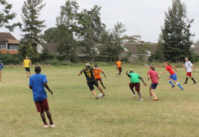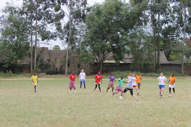 Our schedule kind of reversed today over the past couple days. We left our Guest House around 9:30 as usual but instead of going straight to New Hope Academy in Kibera we headed to the school where the sports camp has been held all week. Today was a highlight for many of the students participating in the sports camp because the 8th graders got to play against the mzungu, the Swahili word for white man, in a game of futball (yes that is soccer in America). In four years of doing this same camp the mzungu are 0-4 (yes that means we have never won). The USA team consisted of individuals from North Park along with those from a Christian school in Austin where Sandy and Karen Baird’s son and daughter-in-law serve. First was the girl’s game.