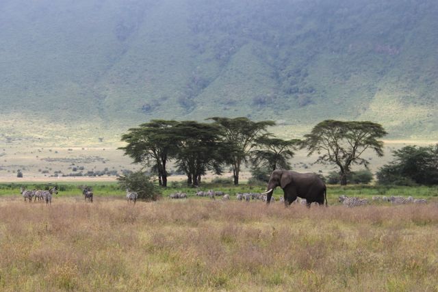 Oh yeah, we had to be completed with breakfast by 6:30 AM. (These early mornings are killing me.) We had to be loaded up in our safari jeeps by 6:45 to make it down to the bottom of the Ngorongoro Crater when the gate opened at 7:00. It is important to be as early as possible because that is usually when the animals are the most active. It was a beautiful drive down the slope some 2,500 feet through an Acacia Tree forest. If you have ever seen, or may be receiving as a souvenir, dark black hand carved animals, people or other objects … the wood is from the Acacia Tree. They are the stereotypical tree you might think of when you think of Africa.