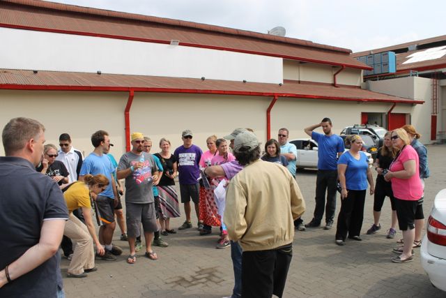 After church we were very privileged to enjoy the hospitality of one of the church members as our entire group of almost forty were invited to dinner at their 10’x20’ home. We were told ahead of time that this family most likely lives on $200 per month and it would be close to $100 to feed this many people. This precious family has been a part of the church since it started here ten years ago. They have two elementary age girls that they taught to tithe and give from a very early age. For dinner we had rice and beef, boiled bananas, salad of cucumbers and tomatoes, and a hot sauce that my mouth is still on fire from.